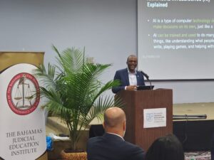Some of the top judicial minds in the Bahamas explored the implications of Artificial Intelligence (AI) on the Caribbean justice system at a judicial training event hosted by the Honorable Chief Justice of The Bahamas, Sir Ian Winder. Mr. Bevil Wooding, the Executive Director of the Caribbean Agency for Justice Solutions (CAJS), delivered a thought-provoking address on the ways in which AI is being used in the courts, and the potential benefits and risks that this technology presents to judiciaries in the Caribbean.